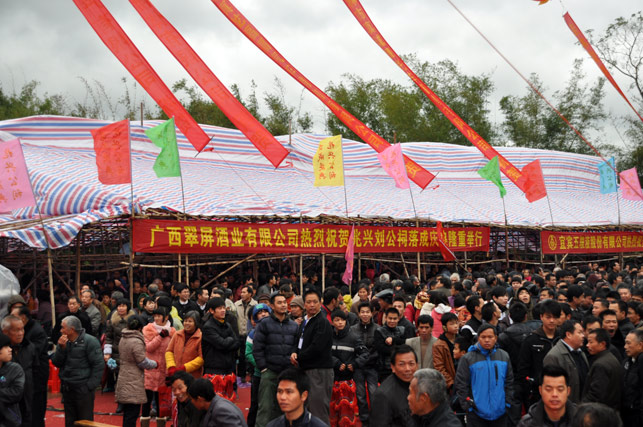 活动现场人山人海,十里八乡的乡亲们都赶过来参加活动,长长的车队从活动现场一直排到了镇子的路口。田边、屋檐上都插满了五颜六色的彩旗,迎风飘扬,好不热闹。咦!眼前几条醒目的横幅特别的引入注目:“广西翠屏酒业有限公司热烈祝贺兆兴刘公祠落成庆典隆重举行”、“宜宾五粮液股份有限公司热烈祝贺兆兴刘公祠落成庆典隆重举行”、“热烈祝贺五粮醇成为公会镇兆兴刘公祠落成庆典唯一指定用酒”、“五粮醇喝少不过瘾 喝多不上头 喝醉醒酒快 畅想美好生活!”没错,您没有看错,我们公司经销的五粮醇是这次大型活动的唯一指定用酒。